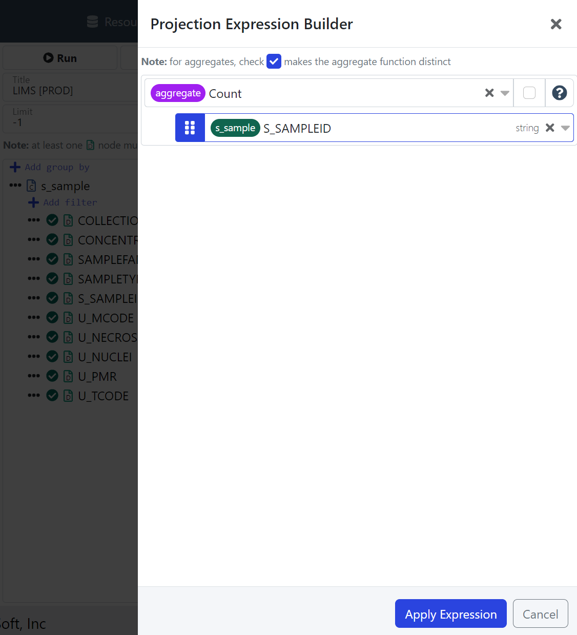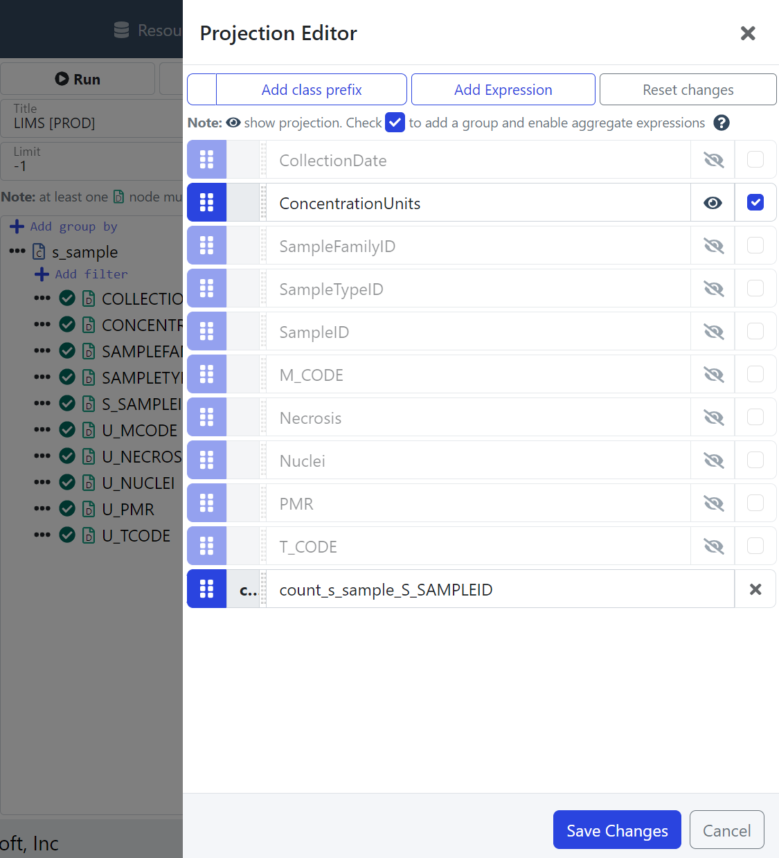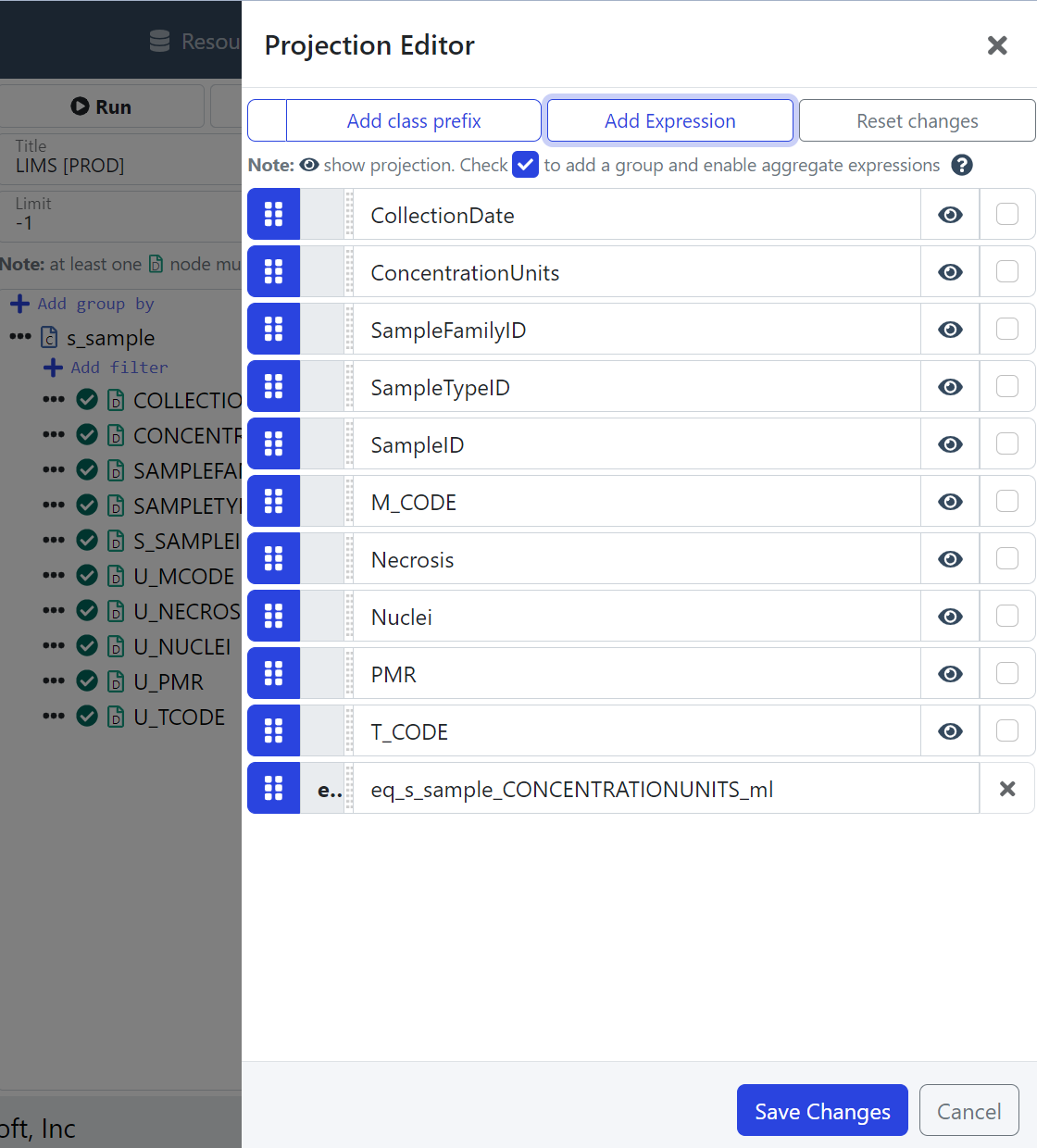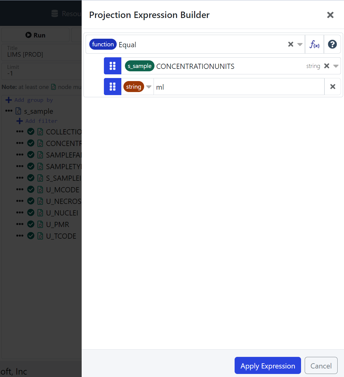 LIMS s_sample Query: Add a Projection Expression equal(CONCENTRATIONUNITS, "ml") | LIMS s_sample Query: Projection Expression equal(CONCENTRATIONUNITS, "ml") |