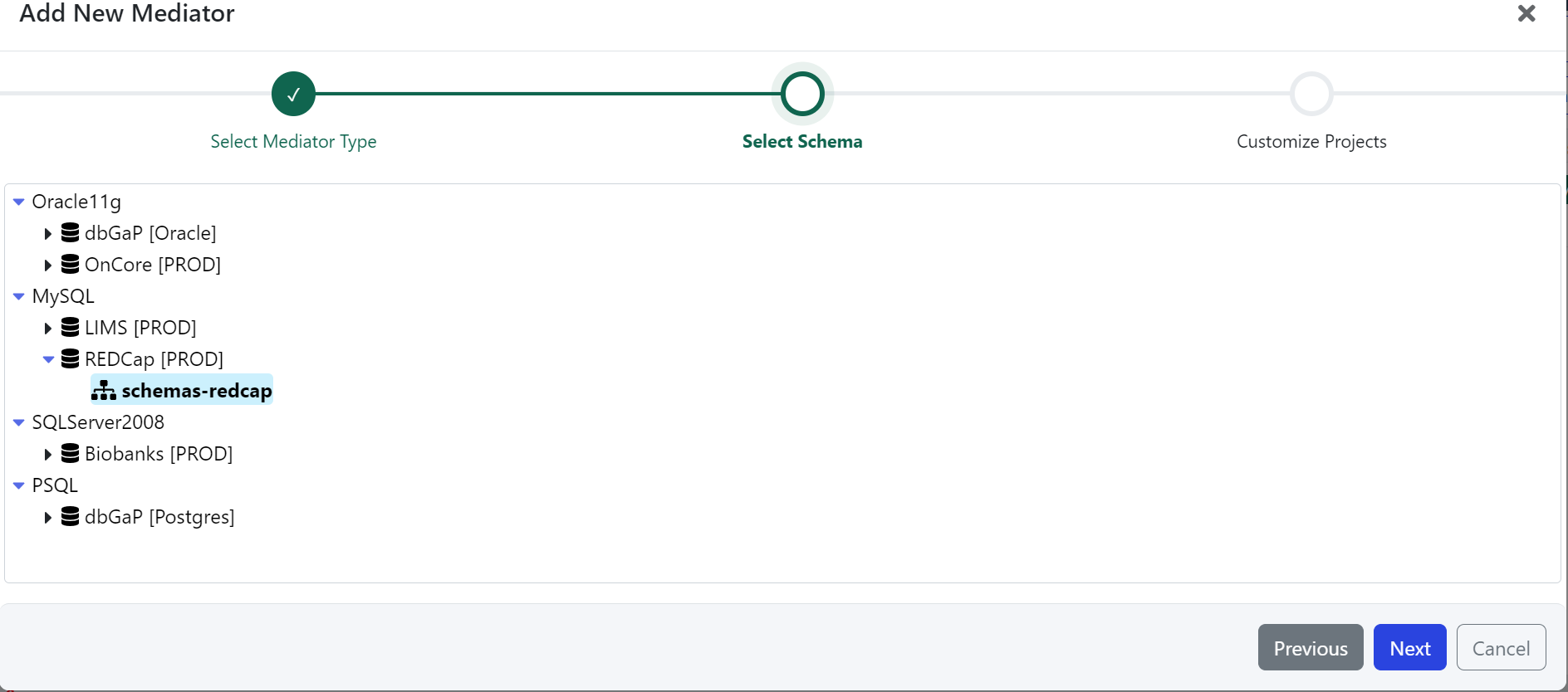 The EDC Mediator Wizard will show you a list of all Database Connections. You must select a compatible REDCap or OnCore schema, or the Wizard will not proceed.