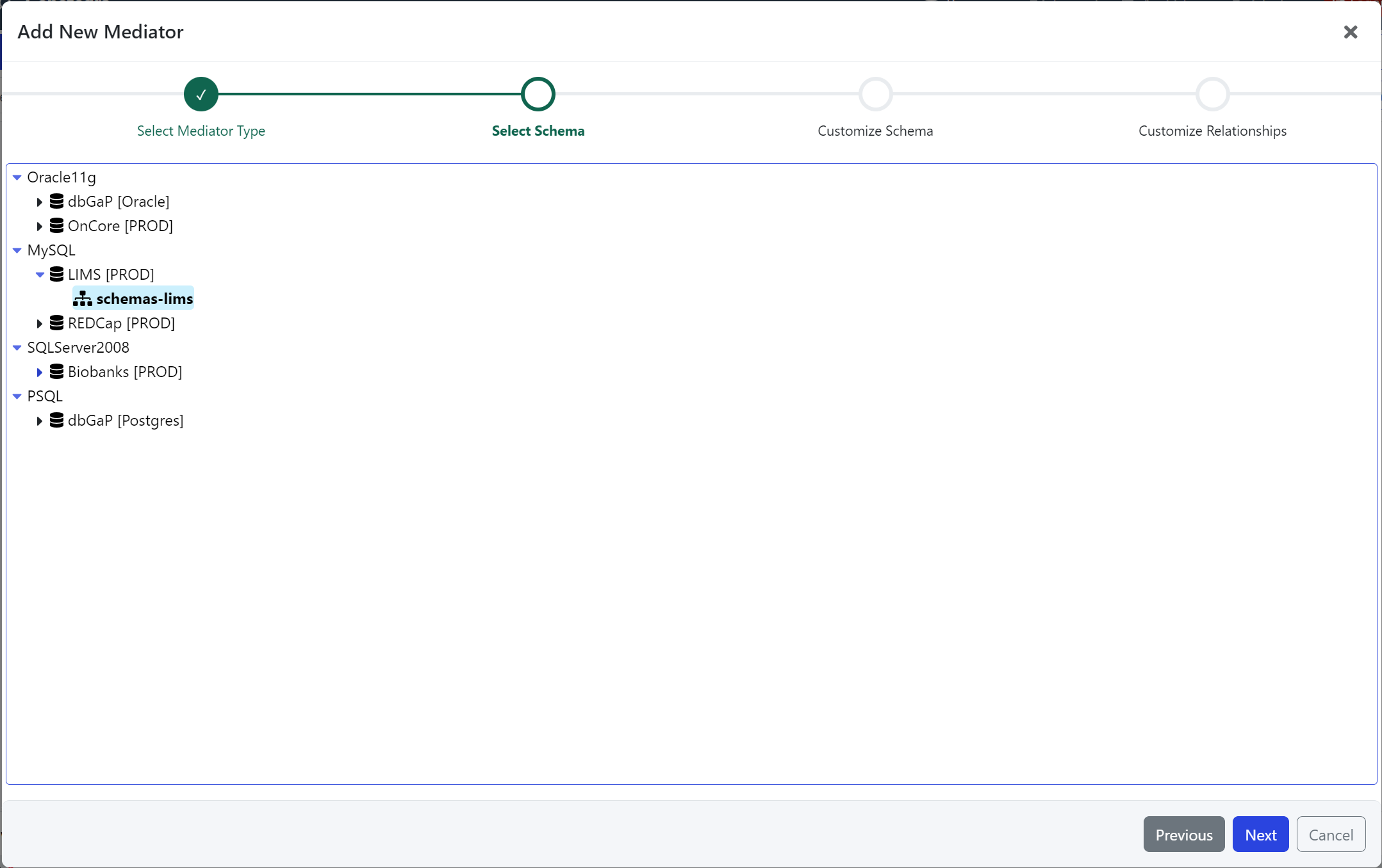 Select a schema and click Next to continue to Customize the Mediator.