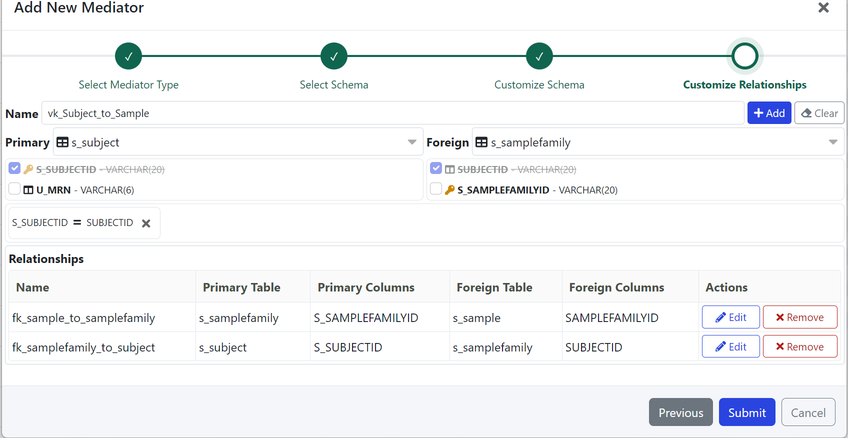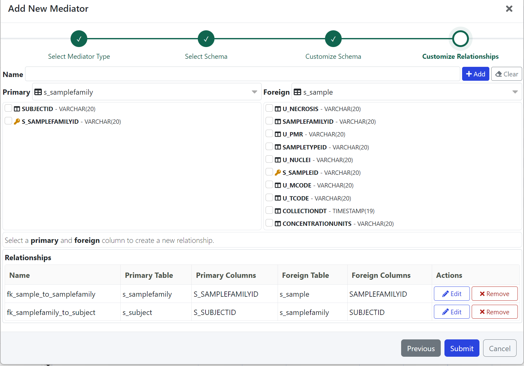 You can customize which relationships to include in the Mediator. By default, all foreign key relationships that reference the selected tables from the previous step are included. You can remove these relationships or Add new ones.