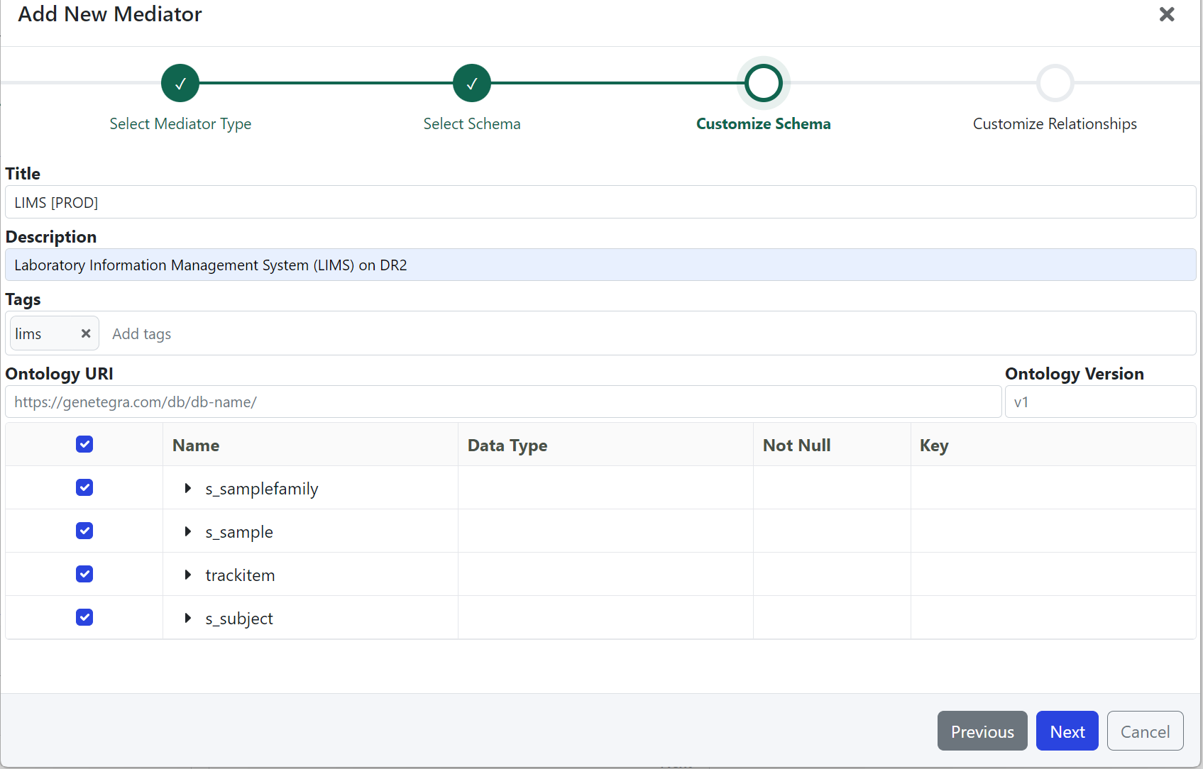 The Customize Schema step lets you specify the Mediator metadata and select which database tables should be included in the Mediator.