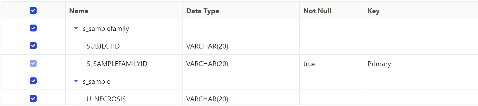 You can customize which tables and columns to include in the Mediator. Clicking on the arrow next to each table expands to view the table's columns. Use the ✅ check box to include or exclude tables and columns from the Mediator. If the table doesn't have a Primary Key, you may need to define a virtual key by selecting Key columns.