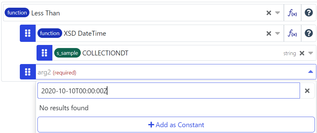 We want to filter results that are less than (before) October 1st, 2020. Currently, you'll need to enter the date in ISO-8601 date format (YYYY-MM-DDTHH:MM:SS), click Add as Constant, then set the data type to dateTime.