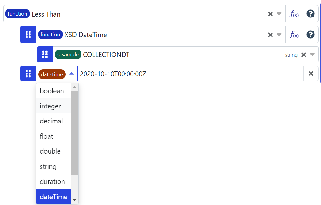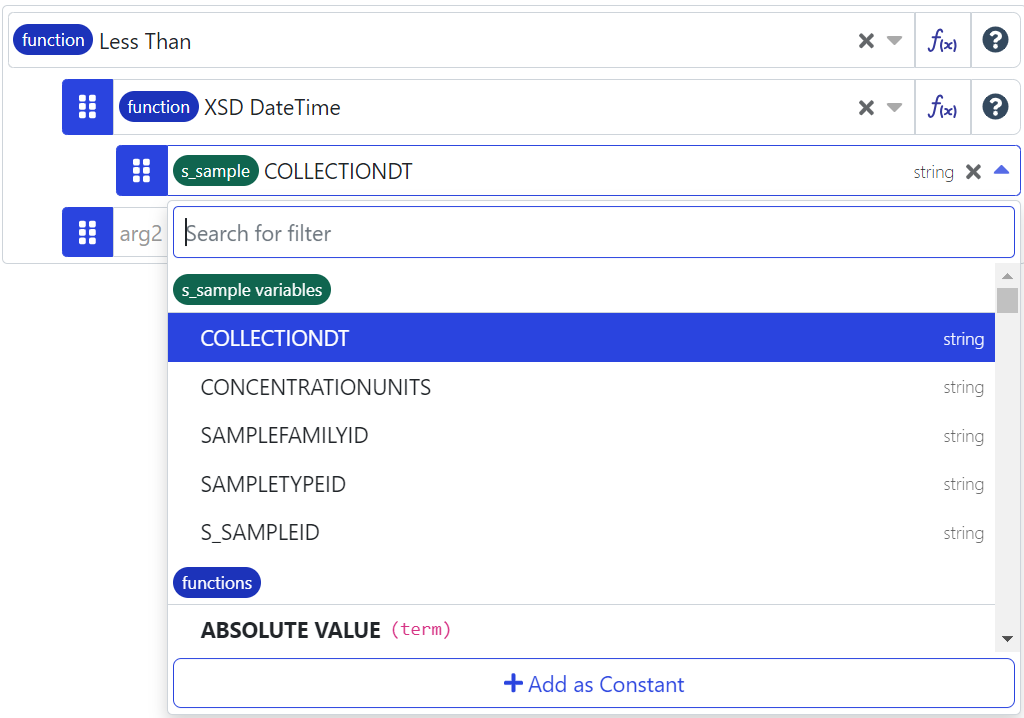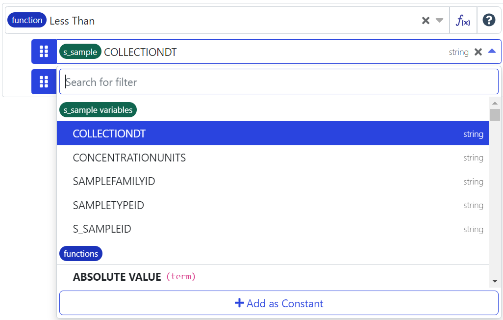 In this example, we will filter all values with a COLLECTIONDT less than October 1st, 2020. So, we choose the Less Than function.