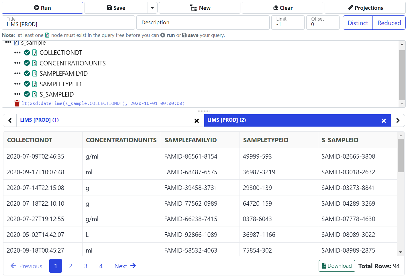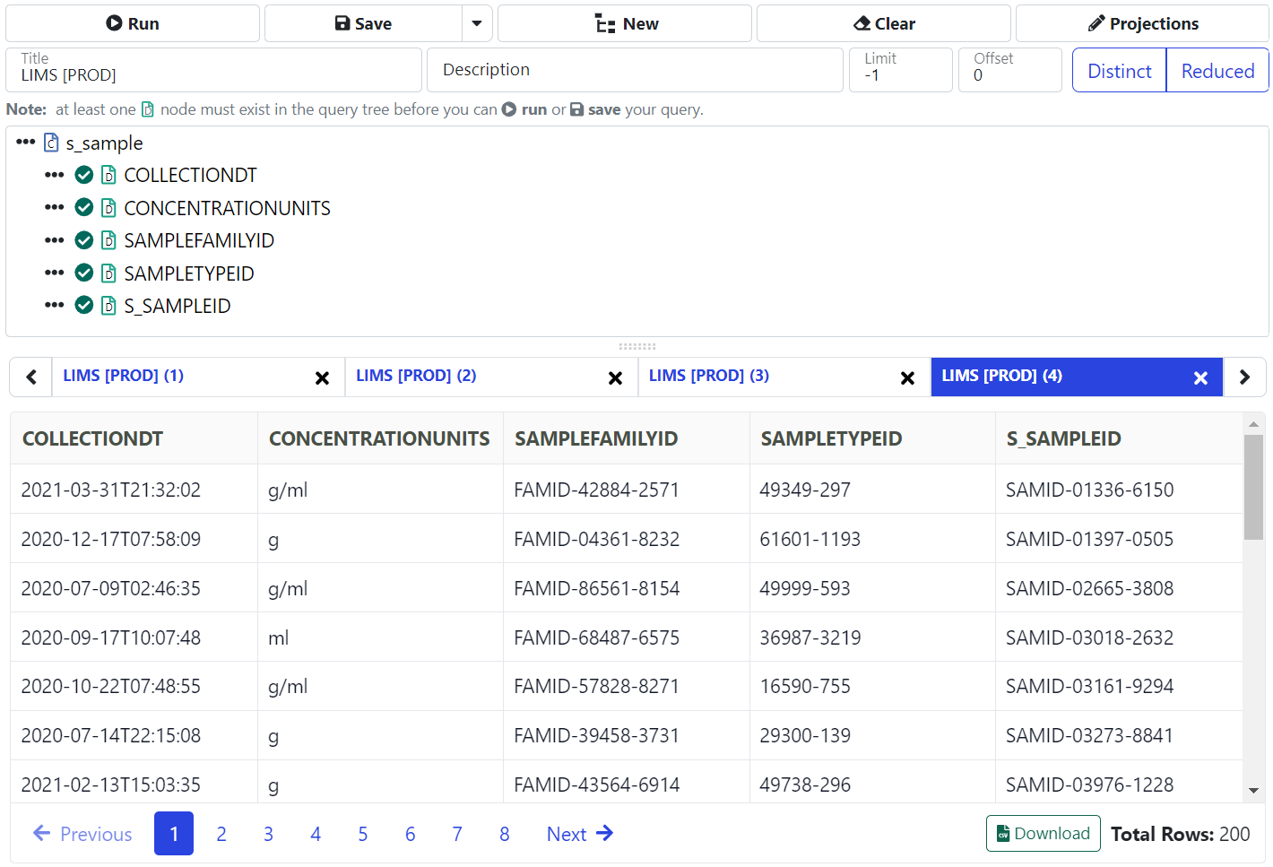 LIMS s_sample Query and Results before adding a Filter. Returns 200 Rows.