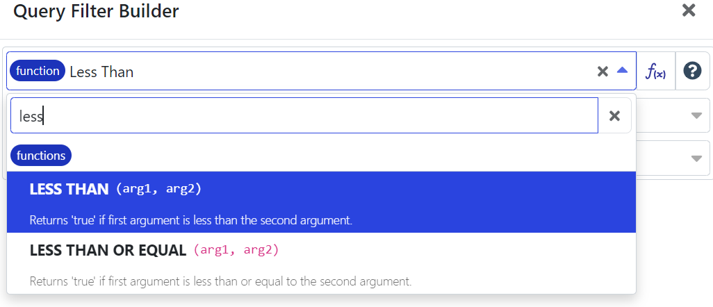 Query Filter Builder: Once the Less Than function is selected, you are prompted to add two arguments (arg1, arg2).