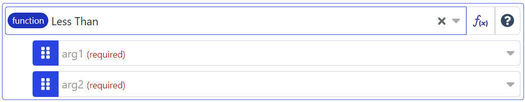 Once the Less Than function is selected, you are prompted to add two arguments (arg1, arg2). For Less Than, the function checks that arg1 < arg2.