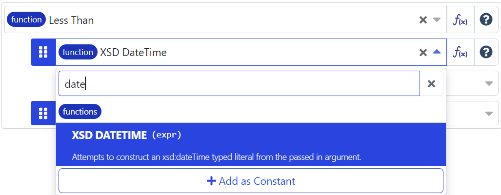 Query Filter Builder: Using the xsd:dateTime function to cast a string to a date.