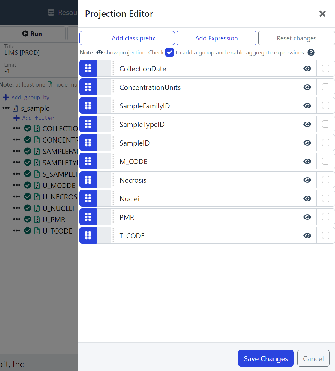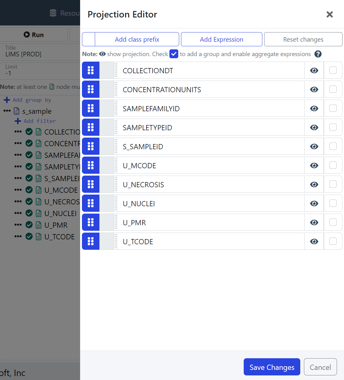 Edit Projections for LIMS s_sample: Before Changing Projection Names