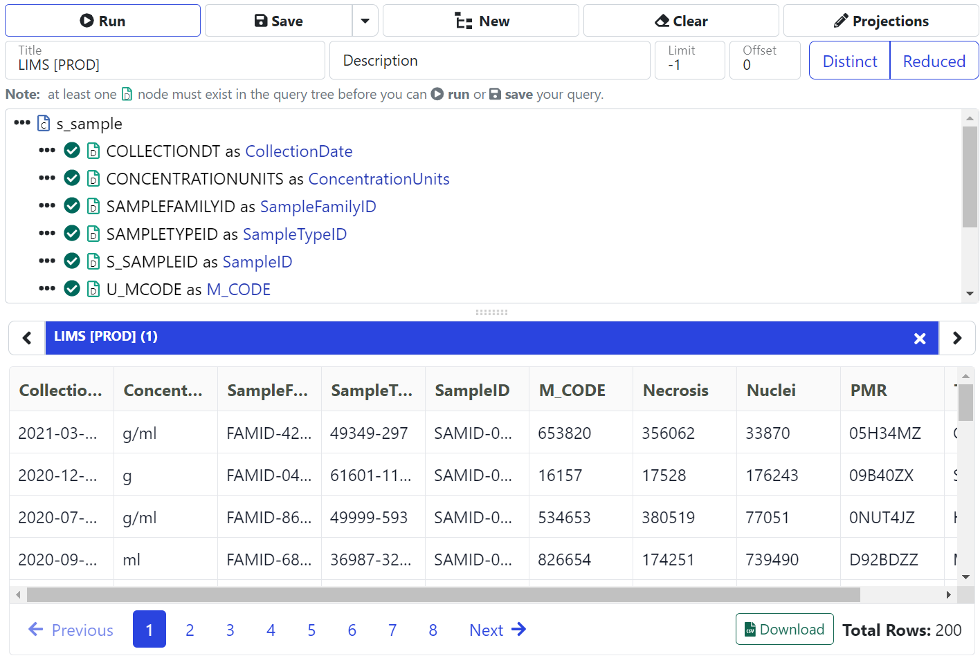 LIMS s_sample Query: Projection Aliases are Presented for Each Property.