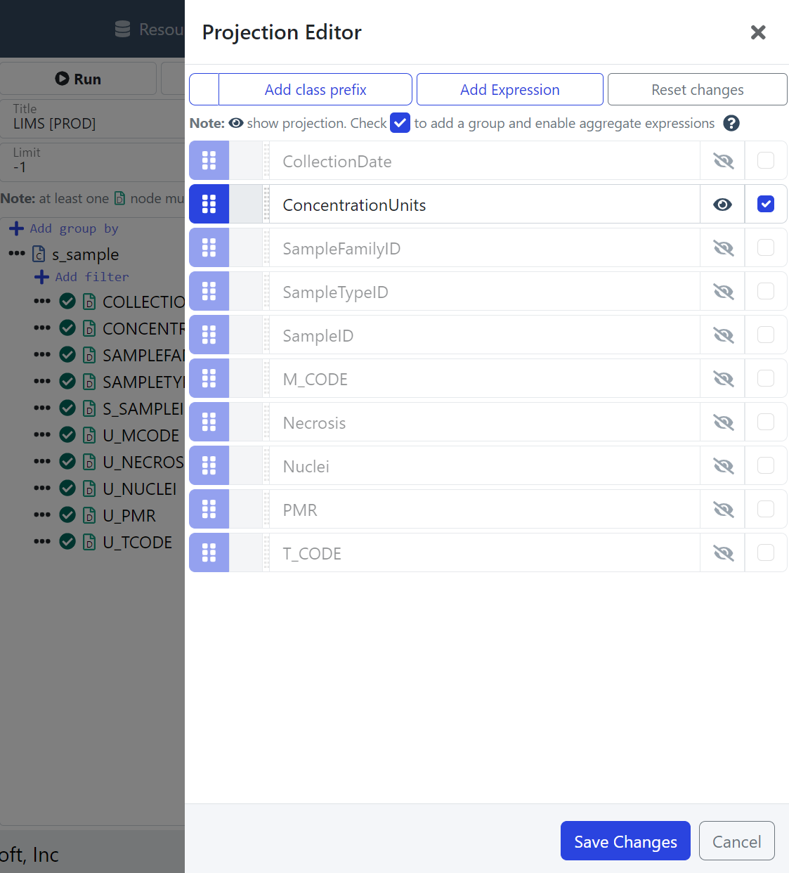 LIMS s_sample Query: Add a Projection Expression equal(CONCENTRATIONUNITS, "ml") | LIMS s_sample Query: Projection Expression equal(CONCENTRATIONUNITS, "ml") |