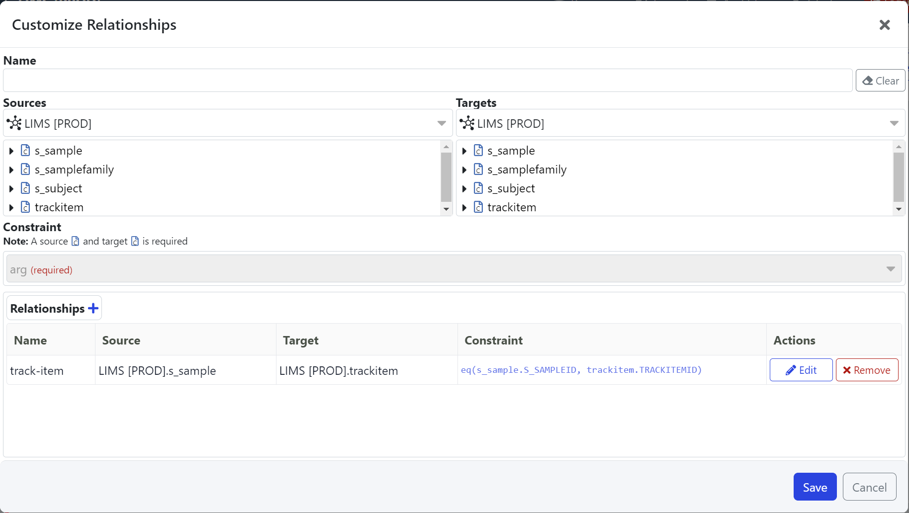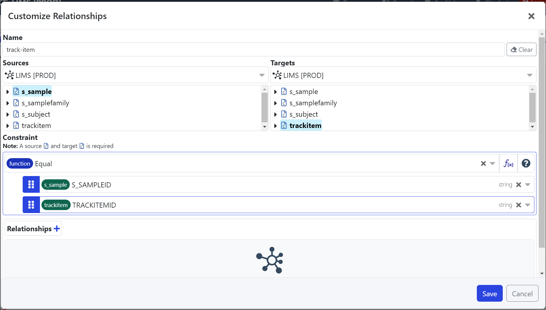 Customize Relationships: Add track-item to link s_sample to trackitem when S_SAMPLEID = TRACKITEMID.